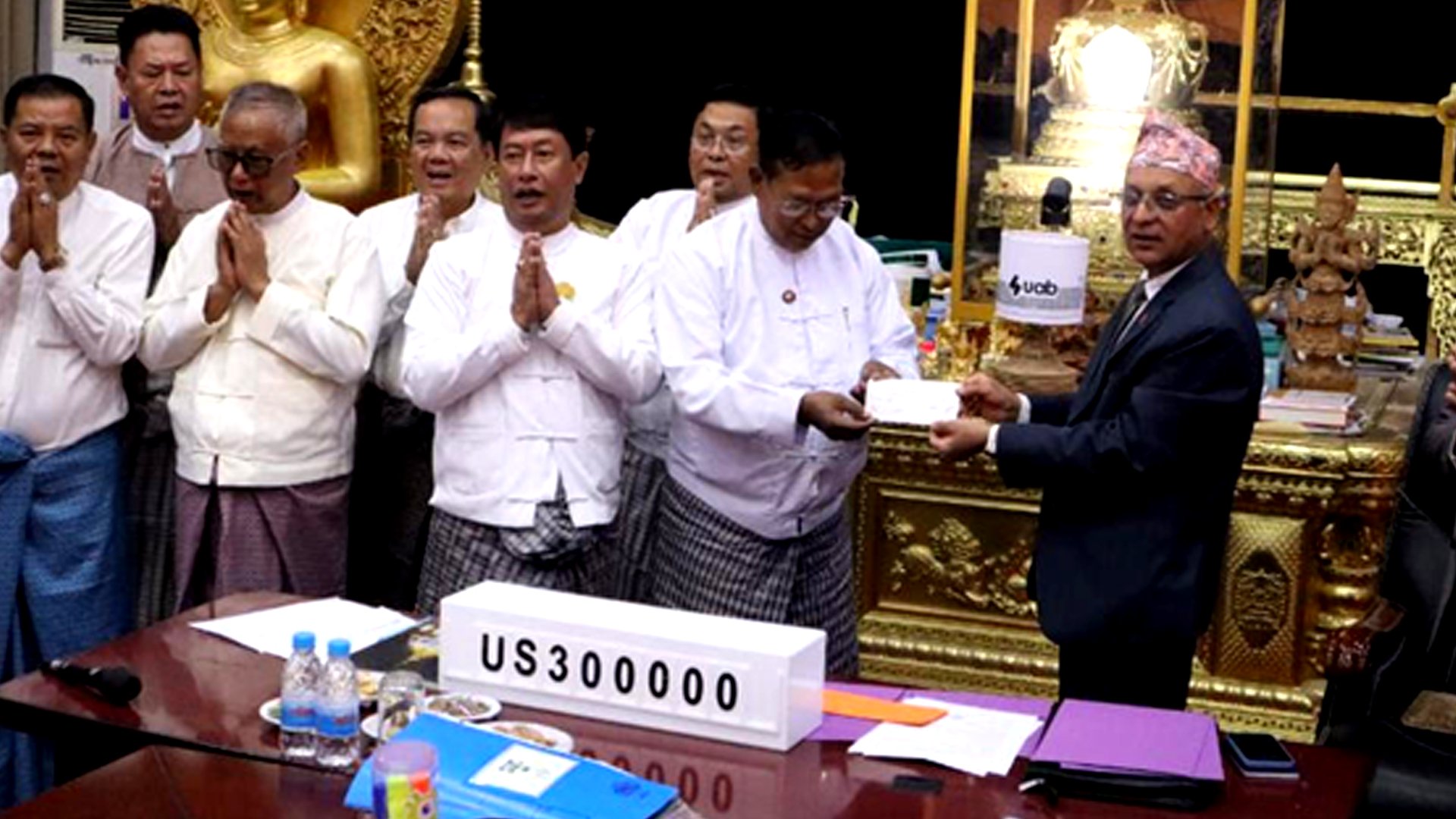 म्यान्मारका लागि नेपालका राजदूत हरिश्चन्द्र घिमिरेले म्यान्मारको मण्डले सहरको दक्षिण–पश्चिम क्षेत्रमा अवस्थित महामुनी पगोडा परिसरमा हालै आयोजित समारोहमा पगोडाका महासचिव थान उलाई तीन लाख अमेरिकी डलरको चेक हस्तान्तरण गर्नुभएको याङ्गुनस्थित नेपालको राजदूतावासले जनाएको छ ।